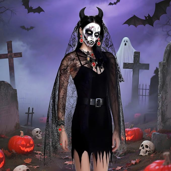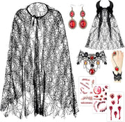 9-Piece Gothic Vampire Halloween Costume Kit – Lace Cape, Horn Headband & Scary Tattoos