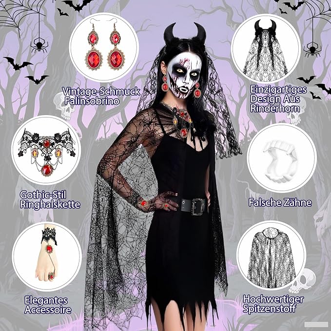 This carefully curated set brings vampire glamour, gothic elegance, and creepy detail together for an unforgettable look. Made with quality lace and durable materials, it’s perfect for Halloween, cosplay, themed parties, or theatrical events.